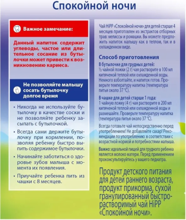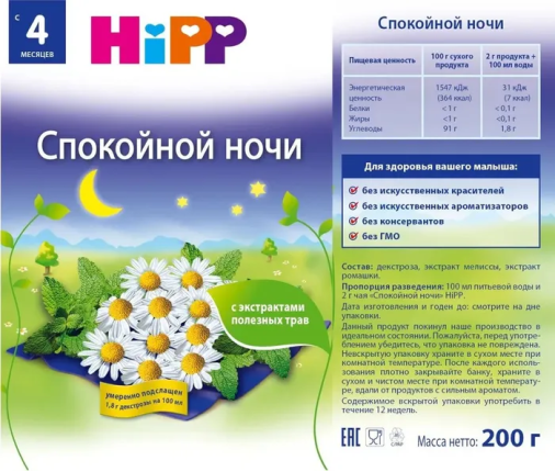 Детский чай HiPP «Спокойной ночи» – это быстрорастворимый, легкий в приготовлении напиток с экстрактами мелиссы и ромашки для детей старше 4 месяцев.