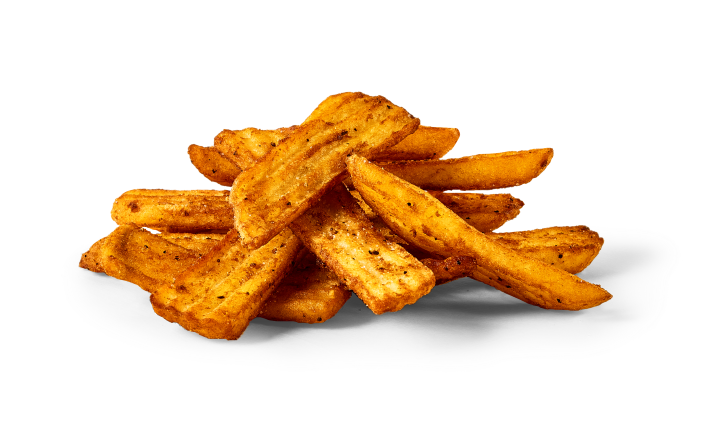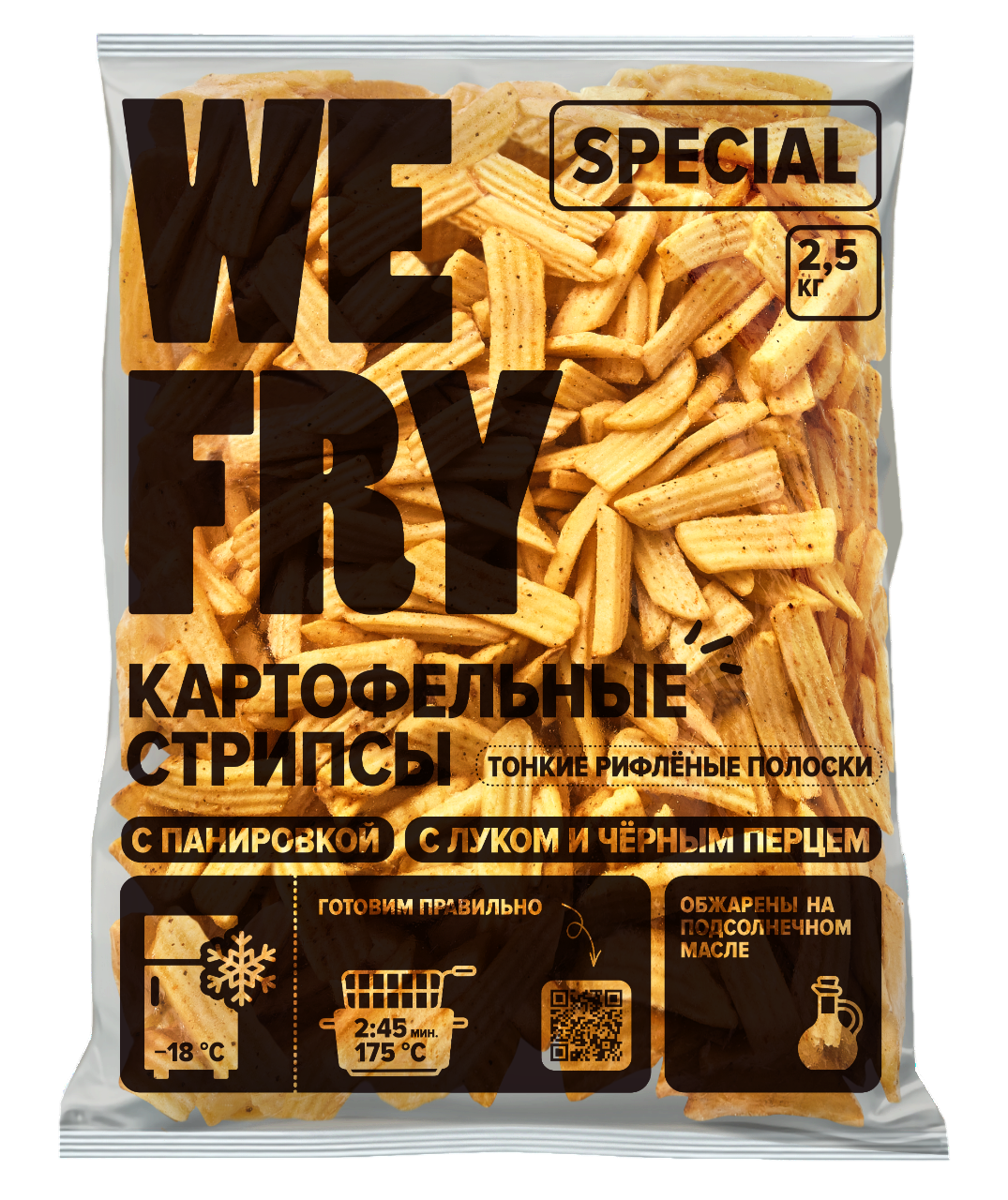 Картофельные стрипсы We Fry — тонкие рифлёные полоски с пикантной ноткой натурального лука и чёрного молотого перца. Этот продукт отлично подавать как в горячем, так и в холодном виде: при остывании стрипсы не теряют текстуру и эффектный вид. Рифлёная форма создана для суперхруста и насыщенного аромата специй, а тонкая нарезка идеальна для подачи с разными соусами.