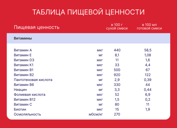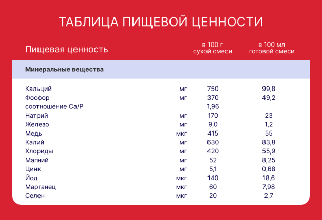 Лактоза, обезжиренное молоко, мальтодекстрин, подсолнечное масло, низкоэруковое рапсовое масло, концентрат сывороточного белка с высоким содержанием α-лактальбумина, молочный жир (сливки), минеральные вещества (натрия цитрат, калия цитрат, калия хлорид, калия гидроксид, кальция карбонат, кальция гидроксид, кальция цитрат, кальция хлорид, кальциевые соли ортофосфорной кислоты, магния сульфат, железа (II) сульфат, цинка сульфат, меди сульфат, марганца сульфат, селенит натрия, йодид калия), эмульгатор (соевый лецитин), рыбий жир, холина хлорид, инозит, антиокислители (концентрат смеси токоферолов, аскорбилпальмитат) , L-карнитин, витамины (ретинола ацетат (А), холекальциферол (D3), фитоменадион (К1), L-аскорбат натрия (С), тиамина гидрохлорид (B1), рибофлавин (В2), никотинамид (РР), пиридоксин гидрохлорид (В6), фолиевая кислота (В9), D-биотин (В7), пантотеновая кислота (D-пантотенат кальция)).