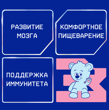 Cухая деминерализованная молочная сыворотка, сухое цельное молоко, мальтодекстрин, растительные масла (подсолнечное высокоолеиновое, соевое, кокосовое), сухое обезжиренное молоко, минеральные вещества (кальция фосфат (кальциевые соли ортофосфорной кислоты), калия цитрат, кальция карбонат, магния хлорид, натрия цитрат, натрия хлорид, железа (II) сульфат, цинка сульфат, меди сульфат, марганца хлорид, йодид калия, селенит натрия), витаминный комплекс (L-аскорбиновая кислота, DL-альфа-токоферола ацетат, никотинамид, D-пантотенат кальция, рибофлавин, ретинола ацетат, пиридоксин гидрохлорид, тиамина гидрохлорид, фолиевая кислота, филлохинон, D-биотин, D3 холекальциферол, цианкобаламин), олигосахарид 2’-фукозиллактоза (2’FL), рыбий жир (источник докозагексаеновой кислоты DHA), таурин, инозит, эмульгатор (соевый лецитин), антиокислитель (L-аскорбилпальмитат).