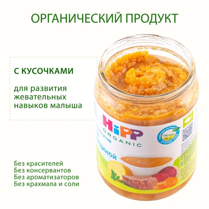 Пюре с кусочками "Борщ с говядиной" HiPP в своем составе содержит свеклу, морковь, картофель, говядину и рапсовое масло и отллично подходит для детского питания с 8 месяцев.