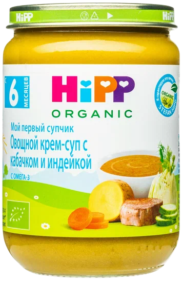 HiPP Пюре HiPP (Хипп) Овощной крем-суп с кабачком и индейкой, 190 г