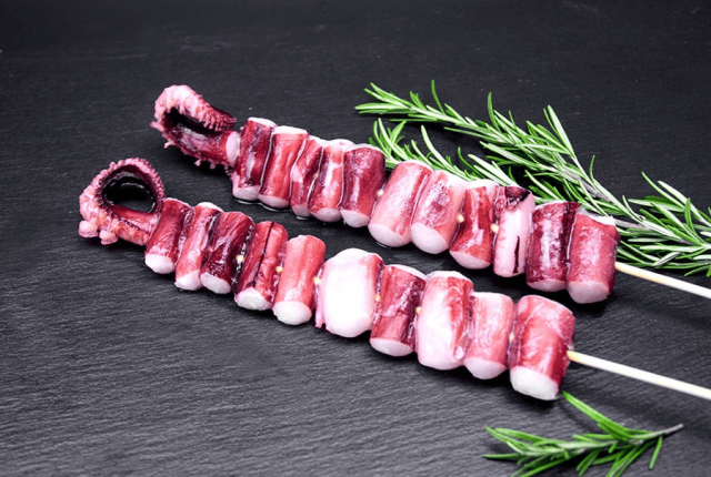 Щупальца гигантского кальмара очищенные представлены на шпажке, что гораздо облегчает процесс приготовления.