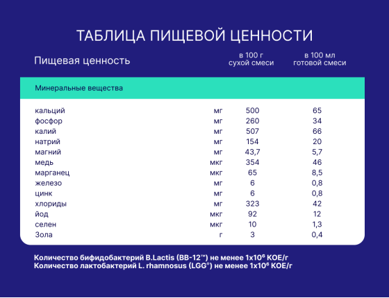 Сухая деминерализованная молочная сыворотка, растительные масла (подсолнечное высокоолеиновое, соевое, кокосовое), сухое цельное молоко, мальтодекстрин, молочный жир, сухое обезжиренное молоко, минеральные вещества (кальция карбонат, калия цитрат, кальция фосфат, натрия хлорид, магния хлорид, калия хлорид, железа (II) сульфат, цинка сульфат, меди сульфат, марганца хлорид, йодид калия, селенит натрия), галактоолигосахариды, концентрат белков молочной сыворотки, рыбий жир (источник докозагексаеновой кислоты DHA), масло Mortierella Alpina (источник арахидоновой кислоты ARA), витаминный комплекс (L-аскорбиновая кислота, DL-альфа-токоферола ацетат, никотинамид, D-пантотенат кальция, рибофлавин, ретинола ацетат, пиридоксин гидрохлорид, тиамина гидрохлорид, фолиевая кислота, филлохинон, D-биотин, D3 холекальциферол, цианкобаламин), концентрат бифидобактерий В.lactis (BB-12™), концентрат лактобактерий L.rhamnosus (LGG), эмульгатор (соевый лецитин), таурин, инозит, нуклеотиды (цитидин-5’-монофосфорная кислота, уридин-5’- монофосфат динатриевая соль, аденозин-5’-монофосфорная кислота, гуанозин-5’-монофосфат динатриевая соль, инозин-5’-монофосфат динатриевая соль), L-карнитин, холина битартрат, антиокислитель (L-аскорбилпальмитат), лютеин. Не содержит ГМО.