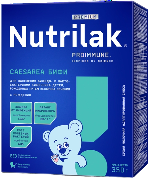 Nutrilak Premium Caesarea БИФИ предназначен для смешанного и искусственного вскармливания детей с первых дней жизни, особенно детей, рожденных путем кесарева сечения, для оптимизации состояния кишечной микробиоты.