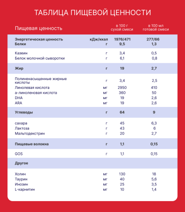 Лактоза, мальтодекстрин, обезжиренное молоко, концентрат сывороточного белка, сливки, подсолнечное масло, рапсовое масло, пальмовое масло, галактоолигосахариды, кокосовое масло, калия цитрат, кальциевые соли ортофофсфорной кислоты, натрия цитрат, эмульгатор (соевый лицитин), калия хлорид, холина хлорид, L-аскорбиновая кислота, рыбий жир, магния хлорид, кальция карбонат, масло Fungal Mortierella alpina (как источник арахидоновой кислоты), таурин, железа (ll) сульфат, кальция гидроксид, аскорбилпальмитат, магния сульфат, инозит, цинка сульфат, L-карнитин, D-α-токоферол, никотинамид, D-пантотенат кальция, меди сульфат, тиамина гидрохлорид, ретинола ацетат, рибофлавин, пиридоксин гидрохлорид, марганца сульфат, йодид калия, фолиевая кислота, селенит натрия, фитоменадион, D-биотин, D3 холекальциферол. Содержит молоко, сливки, рыбий жир.