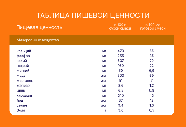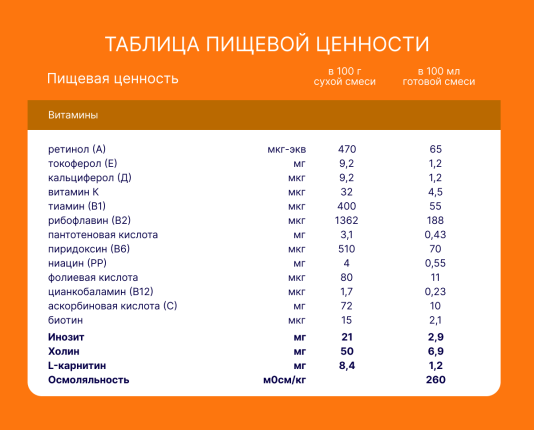 Cухая деминерализованная молочная сыворотка, растительные масла (пальмовое, кокосовое, соевое, подсолнечное высокоолеиновое), мальтодекстрин, сухое обезжиренное молоко, минеральные вещества (калия цитрат, кальция карбонат, кальция фосфат, натрия хлорид, магния хлорид, калия хлорид, железа (ll) сульфат, цинка сульфат, меди сульфат, марганца хлорид, йодид калия, селенит натрия), витаминный комплекс (L-аскорбиновая кислота, DL-альфа-токоферола ацетат, никотинамид, D-пантотенат кальция, рибофлавин, ретинола ацетат, пиридоксина гидрохлорид, тиамина гидрохлорид, фолиевая кислота, филлохинон, D-биотин, D3 холекальциферол, цианокобаламин), эмульгатор (соевый лецитин), таурин, инозит, L-карнитин, антиокислитель (L-аскорбилпальмитат). Не содержит ГМО.