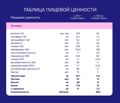 Сухая деминерализованная молочная сыворотка, растительные масла (подсолнечное высокоолеиновое, соевое, кокосовое), сухое цельное молоко, мальтодекстрин, молочный жир, сухое обезжиренное молоко, минеральные вещества (кальция карбонат, калия цитрат, кальция фосфат (кальциевые соли ортофосфорной кислоты), натрия хлорид, магния хлорид, калия хлорид, железа (II) сульфат, цинка сульфат, меди сульфат, йодид калия, марганца хлорид, селенит натрия), рыбий жир (источник докозагексаеновой кислоты DHA), концентрат белков молочной сыворотки, витаминный комплекс (L-аскорбиновая кислота, DL-альфа-токоферола ацетат, никотинамид, D-пантотенат кальция, рибофлавин, ретинола ацетат, пиридоксин гидрохлорид, тиамина гидрохлорид, фолиевая кислота, филлохинон, D-биотин, D3 холекальциферол, цианкобаламин), олигосахарид 2’-фукозиллактоза, масло Mortierella Alpina (источник арахидоновой кислоты ARA), холина битартрат, инозит, таурин, эмульгатор (соевый лецитин), нуклеотиды (цитидин-5’-монофосфорная кислота, уридин-5’-монофосфат динатриевая соль, аденозин-5’-монофосфорная кислота, гуанозин-5’- монофосфат динатриевая соль, инозин-5’-монофосфат динатриевая соль), L-карнитин, антиокислитель (L- аскорбилпальмитат), лютеин. Не содержит ГМО!
