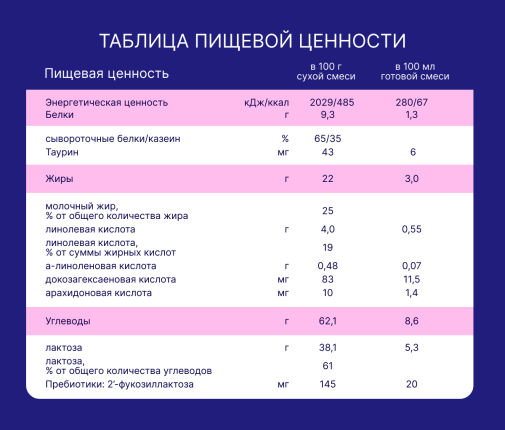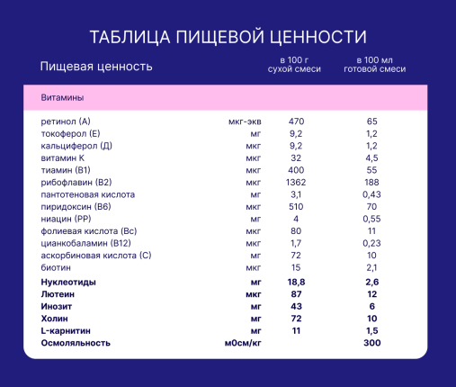 Сухая деминерализованная молочная сыворотка, мальтодекстрин, растительные масла (подсолнечное высокоолеиновое, соевое, кокосовое), сухое цельное молоко, сухое обезжиренное молоко, концентрат белков молочной сыворотки, минеральные вещества (калия цитрат, кальция карбонат, кальция фосфат (кальциевые соли ортофосфорной кислоты), натрия хлорид, магния хлорид, калия хлорид, железа (II) сульфат, цинка сульфат, меди сульфат, марганца хлорид, йодид калия, селенит натрия), молочный жир, рыбий жир (источник докозагексаеновой кислоты DHA ), витаминный комплекс ( L -аскорбиновая кислота, DL -альфа-токоферола ацетат, никотинамид, D - пантотенат кальция, рибофлавин, ретинола ацетат, пиридоксин гидрохлорид, тиамина гидрохлорид, фолиевая кислота, филлохинон, D - биотин, D3 холекальциферол, цианкобаламин), олигосахарид 2’-фукозиллактоза (2'FL), холина битартрат, инозит, таурин, эмульгатор (соевый лецитин), нуклеотиды (цитидин-5’-монофосфорная кислота, уридин-5’- монофосфат динатриевая соль, аденозин-5’-монофосфорная кислота, гуанозин-5’-монофосфат динатриевая соль, инозин-5’-монофосфат динатриевая соль), масло Mortierella Alpina (источник арахидоновой кислоты ARA ), L - карнитин, антиокислитель (L-аскорбилпальмитат), лютеин. Не содержит ГМО!