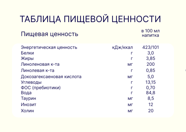 Сбалансированный состав продукта (белок, 29 витаминов и минералов, омега-3, омега-6 жирные кислоты, пребиотики) поможет восполнить нутриенты, которые ребенок не получил во время еды.
