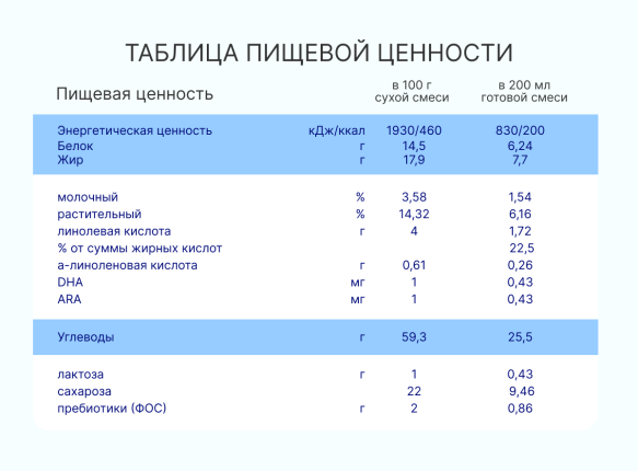 Мальтодекстрин, сахароза, масла растительные (масло соевое, масло кокосовое, масло подсолнечное высокоолеиновое), концентрат молочного белка, изолированный соевый белок, молочный жир, пребиотики (фруктоолигосахариды), натуральный фруктовый порошок Манго (мальтодекстрин, концентрат пюре манго), минеральные вещества (натрия цитрат, магния хлорид, кальция карбонат, калия цитрат, калиевые соли ортофосфорной кислоты, кальциевые соли ортофосфорной кислоты, калия хлорид, натрия хлорид, магниевые соли ортофосфорной кислоты, калия гидроксид, магния сульфат, цинка сульфат, железа (II) сульфат, марганца сульфат, меди сульфат, йодид калия, селенит натрия), ароматизатор натуральный Вкус Манго, витамины (L-аскорбиновая кислота, холина битартрат, DL-альфа-токоферола ацетат, никотинамид, D-пантотенат кальция, ретинола ацетат, тиамина гидрохлорид, пиридоксин гидрохлорид, рибофлавин, фолиевая кислота, филлохинон, D3 холекальциферол, D-биотин, цианкобаламин), нуклеотиды (цитидин-5-монофосфорная кислота, динатрия уридин-5-монофосфат, аденозин-5-монофосфорная кислота, динатрия инозин-5-монофосфат, динатрия гуанозин-5-монофосфат), таурин, инозит, эмульгатор: лецитин соевый, концентрат сухой бифидобактерий (пробиотик), биологическая активная добавка к пище "MEG-3® ‘30’ n-3 Инф Масло" (Омега-3 - источник докозагексаеновой кислоты (DHA)), ARASCO растительное масло из грибов (Омега-6 - источник арахидоновой кислоты (ARA)), антиокислитель: L–аскорбилпальмитат, L-карнитин, лютеин.