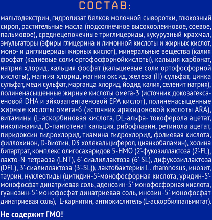 Мальтодекстрин, гидролизат белков молочной сыворотки, глюкозный сироп, растительные масла (подсолнечное высокоолеиновое, соевое, пальмовое), среднецепочечные триглицериды, кукурузный крахмал, эмульгаторы (эфиры глицерина и лимонной кислоты и жирных кислот, моно- и диглицериды жирных кислот), минеральные вещества (калия фосфат (калиевые соли ортофосфорной кислоты), кальция карбонат, натрия хлорид, кальция фосфат (кальциевые соли ортофосфорной кислоты), магния хлорид, магния оксид, железа (II) сульфат, цинка сульфат, меди сульфат, марганца хлорид, йодид калия, селенит натрия), полиненасыщенные жирные кислоты омега-3 (источник докозагексаеновой DHA и эйкозапентаеновой EPA кислот), полиненасыщенные жирные кислоты омега-6 (источник арахидоновой кислоты ARA), витамины (L-аскорбиновая кислота, DL-альфа-токоферола ацетат, никотинамид, D-пантотенат кальция, рибофлавин, ретинола ацетат, пиридоксин гидрохлорид, тиамина гидрохлорид, фолиевая кислота, филлохинон, D-биотин, D3 холекальциферол, цианкобаламин), холина битартрат, комплекс олигосахаридов 5-HMO (2'-фукозиллактоза (2'-FL), лакто-N-тетраоза (LNT), 6'-сиалиллактоза (6'-SL), дифукозиллактоза (DFL), 3'-сиалиллактоза (3'-SL)), лактобактерии L. rhamnosus, инозит, таурин, нуклеотиды (цитидин-5’-монофосфорная кислота, уридин-5’-монофосфат динатриевая соль, аденозин-5’-монофосфорная кислота, гуанозин-5’-монофосфат динатриевая соль, инозин-5’-монофосфат динатриевая соль), L-карнитин, антиокислитель (L-аскорбилпальмитат). Не содержит ГМО!