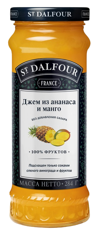 Натуральный фруктовый джем из ананаса и манго без сахара. В качестве подсластителя используется виноградный сок. Готовится при низких температурах, благодаря чему сохраняется естественный вкус спелых фруктов. Не содержит консервантов, ароматизаторов, красителей.