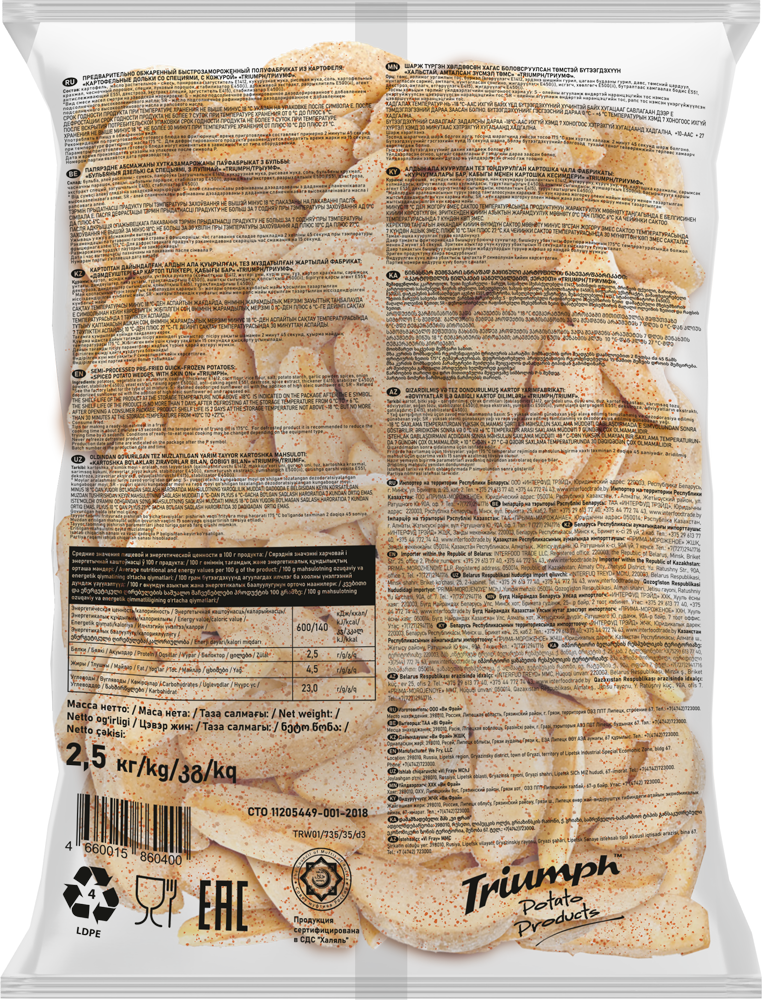 В картофельных дольках Triumph сочетается классический баланс текстуры и вкуса. Дольки без панировки с кожурой и специями. Способ приготовления: картофельные дольки готовьте во фритюре 2 минуты 45 секунд при температуре фритюрного масла 175 С.
