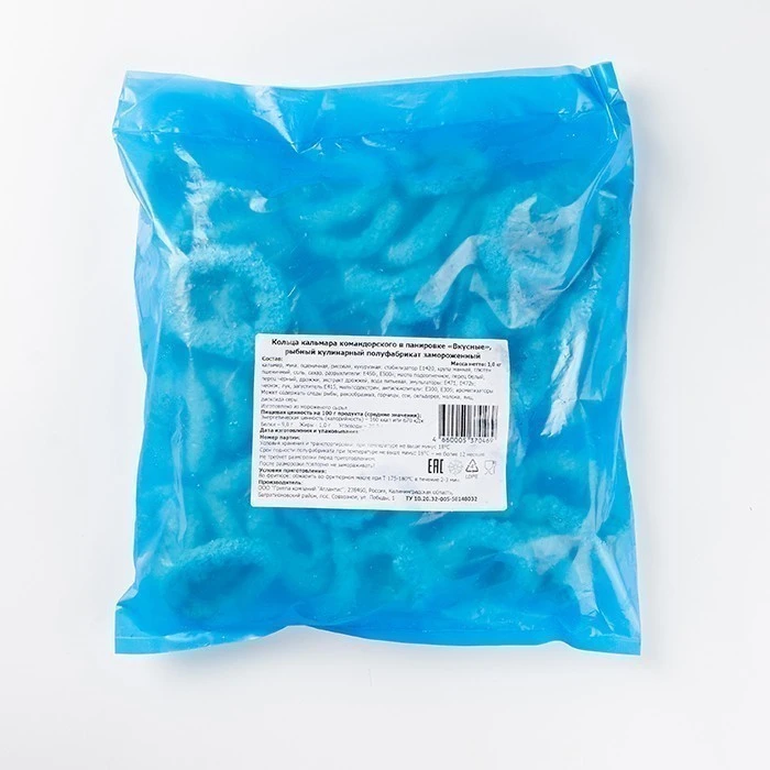кальмар, мука пшеничная, рисовая, кукурузная, стабилизатор Е1420, крупа манная,глютен пшеничный, соль, сахар, разрыхлители, масло подсолнечное, перец белый, перец черный, дрожжи, экстракт дрожжей, вода питьевая, эмульгаторы, чеснок, лук, загустители Е415, ароматизаторы