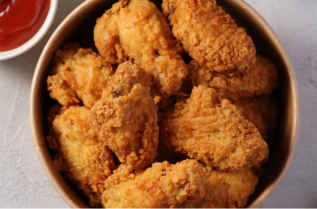 Крылышки в панировке очень хрустящее снаружи и сочное внутри. Крыло состоит из плечевой и локтевой части с добавлением специй и пряностей, таких как перец чили, смесь белого и черного перца, за полноту и насыщенность вкуса отвечает лук и чеснок.