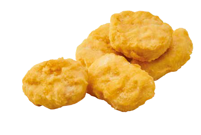 Филе цыплят-бройлеров, вода, пшеничная мука, кукурузная мука, пшешеничный крахмал, соль, разрыхлители: Е450, Е500; декстроза, подсолнечное масло, кожа цыплят-бройлеров, картофельный крахмал, манная крупа, пшеничная клейковина, черный перец, ароматизатор.