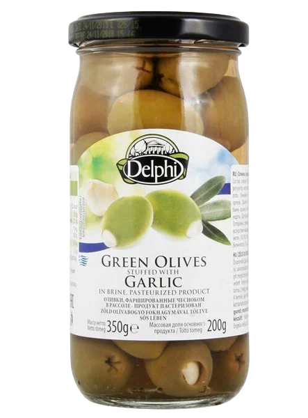 оливки без косточек (47,6%), вода, чеснок (9,5%), морская, соль, регулятор кислотности: молочная кислота, лимонная кислота.