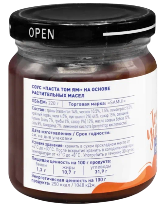 Травы (галангал 14%, чеснок 10.5%, 7.5%, лемонграсс 5.5%, красный перец чили 4.5%, лук-шалок 2%) 44%, сахар 15%, овощной бульон (соль 7%, грибы 4%, сахар 1%) 12%, масло соевых бобов 12%, соль 8%, маринад 7%, лимонная кислота (регулятор кислотности).