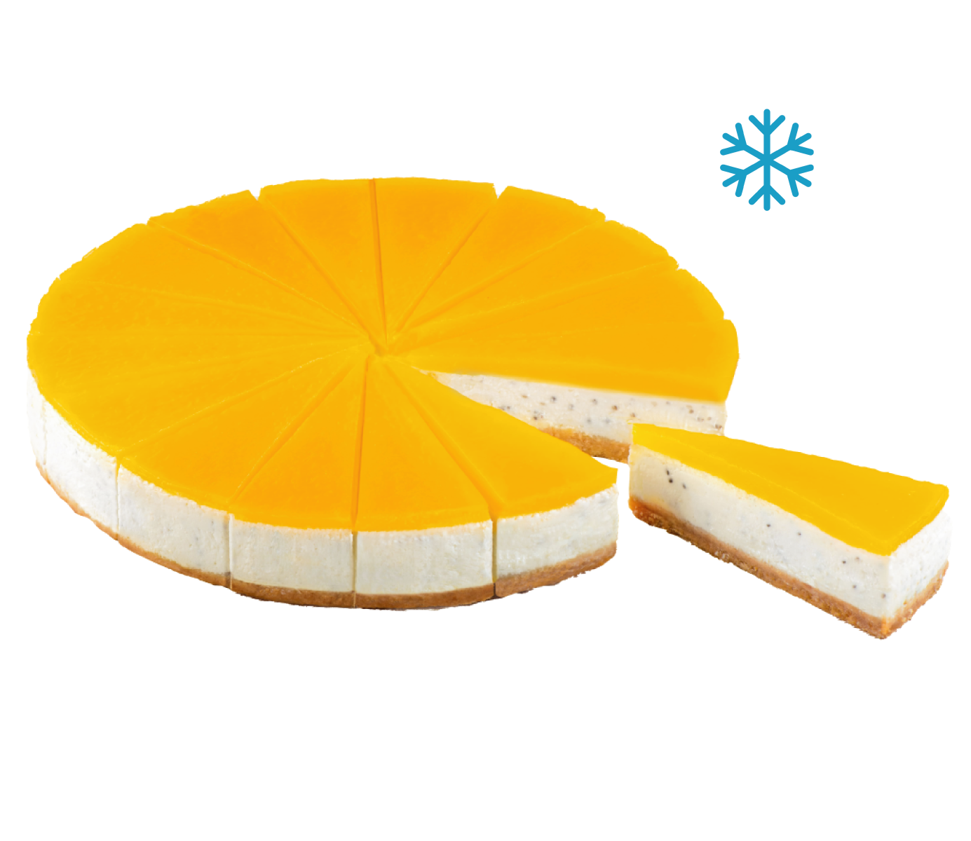 Оригинальный чизкейк с семенами чиа, на основе натурального сливочного сыра и рассыпчатого сахарного печенья, с верхним слоем из пюре манго.