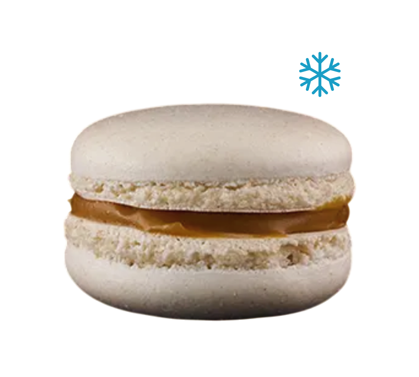 Французское пирожное макарон с начинкой карамель. Самый популярный Парижский десерт на протяжении более 150 лет. Тончайшая сахарная корочка, под которой скрывается нежное миндальное безе, тающее во рту. Изготавливается вручную по уникальной технологии и является одним из самых изысканных кондитерских творений.