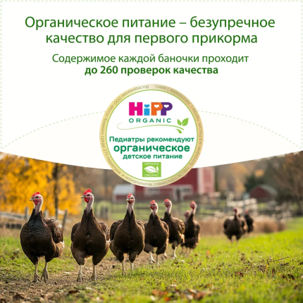HiPP органическая индейка обладает приятным вкусом и нежной консистенцией, которая очень нравится малышам. Мясо индейки богато белками, витаминами и минералами, а также является отличным источником фосфора и калия. Железо из мяса индейки легко усваивается, что является прекрасной профилактикой железодефицитной анемии у детей.