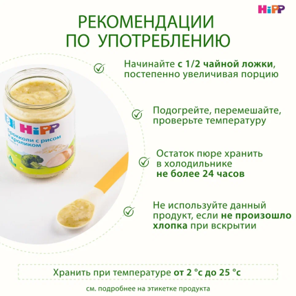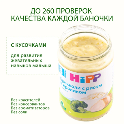 Брокколи в составе пюре "Брокколи с рисом и кроликом" HiРР - низкоаллергенный продукт, является источником калия, кальция, фолиевой кислоты, клетчатки, а также витамина С и железа. Эти витамины и микроэлементы играют важную роль для развития иммунной системы и кровообращения.