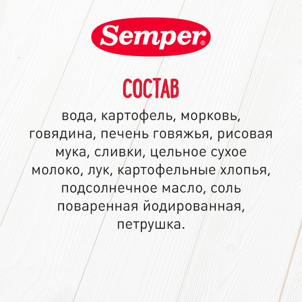 Вода, картофель, морковь, говядина, печень говяжья, рисовая мука, сливки, цельное сухое молоко, лук, картофельные хлопья, подсолнечное масло, соль поваренная йодированная, петрушка.