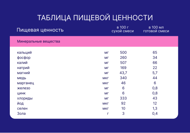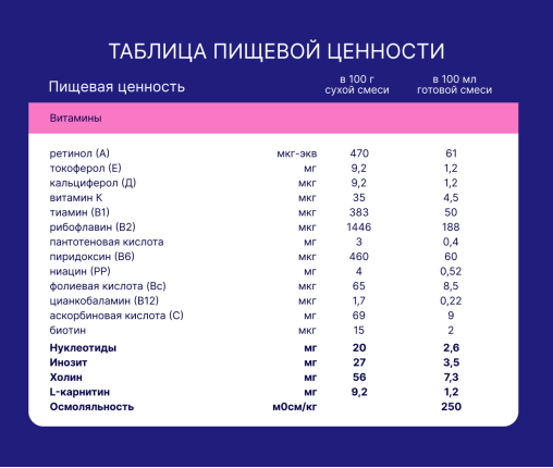 Сухая деминерализованная молочная сыворотка, сухое цельное молоко, растительные масла (подсолнечное высокоолеиновое, соевое, кокосовое), мальтодекстрин, сухое обезжиренное молоко, загуститель (натуральная камедь рожкового дерева), молочный жир, рыбный жир (источник докозагексаеновой кислоты DHA), минеральные вещества (кальция карбонат, калия хлорид, натрия хлорид, магния хлорид, калия цитрат, калия фосфат (калиевые соли ортофосфорной кислоты), железа (ll) сульфат, цинка сульфат, меди сульфат, марганца хлорид, йодид калия, селенит натрия), витамины (L-аскорбиновая кислота, DL-альфа-токоферола ацетат, никотинамид, D-пантотенат кальция, рибофлавин, ретинол ацетат, пиридоксин гидрохлорид, тиамина гидрохлорид, фолиевая кислота, филлохинон, D-биотин, D3 холекальциферол, цианокобаламин), эмульгатор (соевый лецитин), таурин, инозит, нуклеотиды (цитидин-5’-монофосфорная кислота, уридин-5’- монофосфат динатриевая соль, аденозин-5’-монофосфорная кислота, гуанозин-5’-монофосфат динатриевая соль, инозин-5’-монофосфат динатриевая соль), L-карнитин, антиокислитель (L-аскорбилпальмитат).