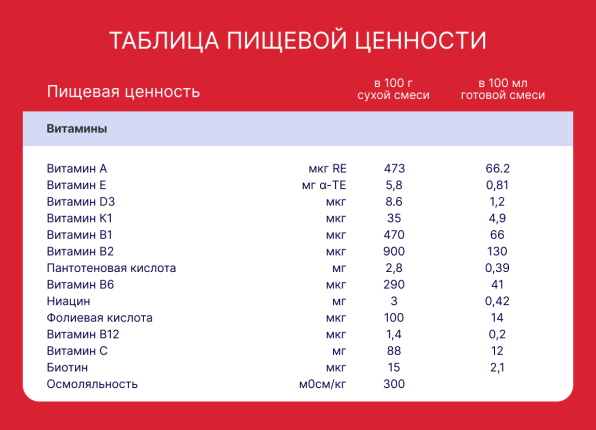 Лактоза, мальтодекстрин, обезжиренное молоко, концентрат сывороточного белка, сливки, подсолнечное масло, рапсовое масло, пальмовое масло, галактоолигосахариды, кокосовое масло, калия цитрат, кальциевые соли ортофофсфорной кислоты, натрия цитрат, эмульгатор (соевый лицитин), калия хлорид, холина хлорид, L-аскорбиновая кислота, рыбий жир, магния хлорид, кальция карбонат, масло Fungal Mortierella alpina (как источник арахидоновой кислоты), таурин, железа (ll) сульфат, кальция гидроксид, аскорбилпальмитат, магния сульфат, инозит, цинка сульфат, L-карнитин, D-α-токоферол, никотинамид, D-пантотенат кальция, меди сульфат, тиамина гидрохлорид, ретинола ацетат, рибофлавин, пиридоксин гидрохлорид, марганца сульфат, йодид калия, фолиевая кислота, селенит натрия, фитоменадион, D-биотин, D3 холекальциферол. Содержит молоко, сливки, рыбий жир.