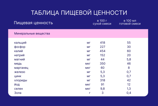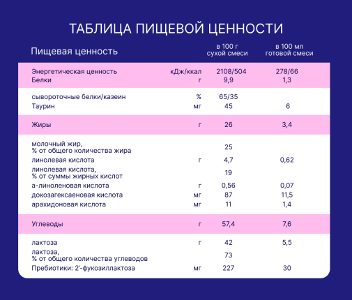 Сухая деминерализованная молочная сыворотка, растительные масла (подсолнечное высокоолеиновое, соевое, кокосовое), сухое цельное молоко, мальтодекстрин, молочный жир, сухое обезжиренное молоко, минеральные вещества (кальция карбонат, калия цитрат, кальция фосфат (кальциевые соли ортофосфорной кислоты), натрия хлорид, магния хлорид, калия хлорид, железа (II) сульфат, цинка сульфат, меди сульфат, йодид калия, марганца хлорид, селенит натрия), рыбий жир (источник докозагексаеновой кислоты DHA), концентрат белков молочной сыворотки, витаминный комплекс (L-аскорбиновая кислота, DL-альфа-токоферола ацетат, никотинамид, D-пантотенат кальция, рибофлавин, ретинола ацетат, пиридоксин гидрохлорид, тиамина гидрохлорид, фолиевая кислота, филлохинон, D-биотин, D3 холекальциферол, цианкобаламин), олигосахарид 2’-фукозиллактоза, масло Mortierella Alpina (источник арахидоновой кислоты ARA), холина битартрат, инозит, таурин, эмульгатор (соевый лецитин), нуклеотиды (цитидин-5’-монофосфорная кислота, уридин-5’-монофосфат динатриевая соль, аденозин-5’-монофосфорная кислота, гуанозин-5’- монофосфат динатриевая соль, инозин-5’-монофосфат динатриевая соль), L-карнитин, антиокислитель (L- аскорбилпальмитат), лютеин. Не содержит ГМО!