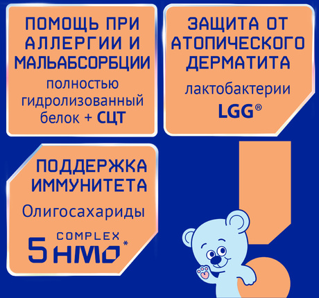 Полностью гидролизованный белок расщиплен до коротких пептидов и свободных аминокислот, облегчает симптомы аллергии.