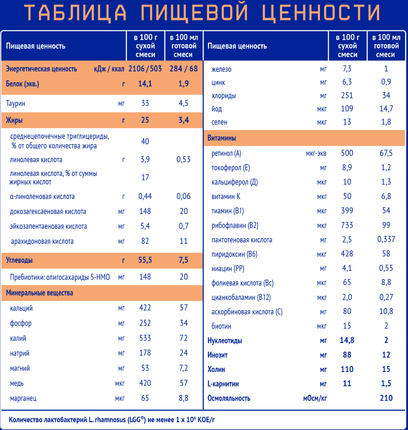 Мальтодекстрин, гидролизат белков молочной сыворотки, глюкозный сироп, растительные масла (подсолнечное высокоолеиновое, соевое, пальмовое), среднецепочечные триглицериды, кукурузный крахмал, эмульгаторы (эфиры глицерина и лимонной кислоты и жирных кислот, моно- и диглицериды жирных кислот), минеральные вещества (калия фосфат (калиевые соли ортофосфорной кислоты), кальция карбонат, натрия хлорид, кальция фосфат (кальциевые соли ортофосфорной кислоты), магния хлорид, магния оксид, железа (II) сульфат, цинка сульфат, меди сульфат, марганца хлорид, йодид калия, селенит натрия), полиненасыщенные жирные кислоты омега-3 (источник докозагексаеновой DHA и эйкозапентаеновой EPA кислот), полиненасыщенные жирные кислоты омега-6 (источник арахидоновой кислоты ARA), витамины (L-аскорбиновая кислота, DL-альфа-токоферола ацетат, никотинамид, D-пантотенат кальция, рибофлавин, ретинола ацетат, пиридоксин гидрохлорид, тиамина гидрохлорид, фолиевая кислота, филлохинон, D-биотин, D3 холекальциферол, цианкобаламин), холина битартрат, комплекс олигосахаридов 5-HMO (2'-фукозиллактоза (2'-FL), лакто-N-тетраоза (LNT), 6'-сиалиллактоза (6'-SL), дифукозиллактоза (DFL), 3'-сиалиллактоза (3'-SL)), лактобактерии L. rhamnosus, инозит, таурин, нуклеотиды (цитидин-5’-монофосфорная кислота, уридин-5’-монофосфат динатриевая соль, аденозин-5’-монофосфорная кислота, гуанозин-5’-монофосфат динатриевая соль, инозин-5’-монофосфат динатриевая соль), L-карнитин, антиокислитель (L-аскорбилпальмитат). Не содержит ГМО!