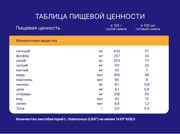 Мальтодекстрин, лактоза (молочный сахар), растительные масла (подсолнечное высокоолеиновое, соевое, кокосовое), частично гидролизованный белок молочной сыворотки, молочный жир, кукурузный крахмал, эмульгаторы (эфиры глицерина и лимонной кислоты и жирных кислот, моно- и диглицериды жирных кислот), минеральные вещества (кальция фосфат (кальциевые соли ортофосфорной кислоты), натрия хлорид, железа (II) сульфат, цинка сульфат, меди сульфат, марганца хлорид, йодид калия, селенит натрия), полиненасыщенные жирные кислоты омега-3 и омега-6 (источник докозагексаеновой DHA, эйкозапентаеновой EPA и арахидоновой ARA кислот), фруктоолигосахариды, витамины (L-аскорбиновая кислота, DL-альфа-токоферола ацетат, никотинамид, D-пантотенат кальция, рибофлавин, ретинола ацетат, пиридоксин гидрохлорид, тиамина гидрохлорид, фолиевая кислота, филлохинон, D-биотин, D3 холекальциферол, цианкобаламин), комплекс олигосахаридов 5-HMO (2'-фукозиллактоза (2'-FL), лакто-N-тетраоза (LNT), 6'-сиалиллактоза (6'-SL), дифукозиллактоза (DFL), 3'-сиалиллактоза (3'-SL)), холина битартрат, лактобактерии L. rhamnosus (LGG®), таурин, инозит, нуклеотиды (цитидин-5’-монофосфорная кислота, уридин-5’-монофосфат динатриевая соль, аденозин-5’-монофосфорная кислота, гуанозин-5’-монофосфат динатриевая соль, инозин-5’-монофосфат динатриевая соль), L-карнитин, антиокислитель (L-аскорбилпальмитат). Не содержит ГМО!