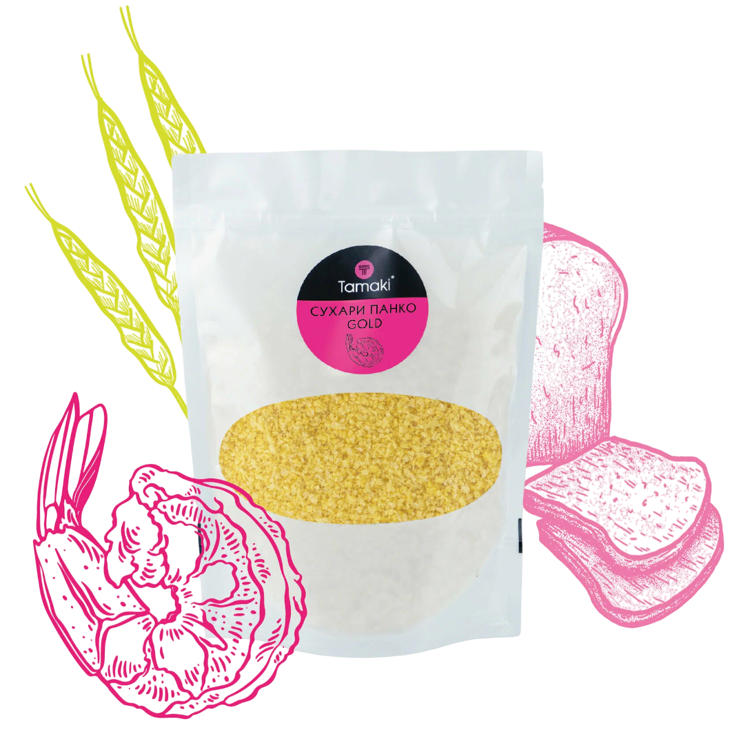 Сухари Gold изготавливаются из хлеба без корочек, за счет чего их структура однородная. У Панко Gold идеальная фракция 4 мм. Они не впитывают в себя масло и не образуют сухарную крошку. В готовом виде сухари приобретают яркий золотисто-оранжевый цвет, который получается за счет использования куркумы.