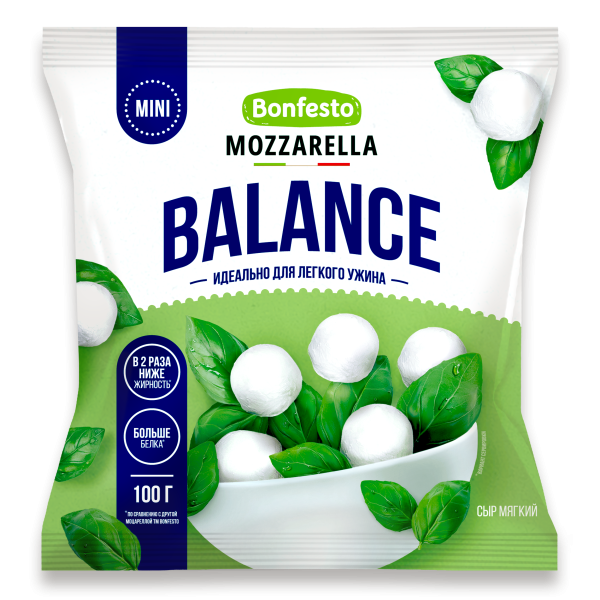 Моцарелла Bonfesto Balance - сыр, в котором всё идеально сбалансировано: в 2 раза меньше жира, больше белка и всё тот же вкус вашего любимого сыра. C Bonfesto Balance вам не нужно долго думать, какое полезное, и самое главное, вкусное блюдо можно приготовить. Сыры Balance станут прекрасным дополнением ланч-бокса или легкого салата на ужин.