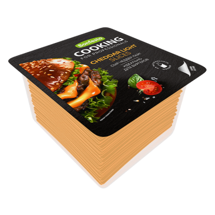 Сыр полутвердый «Чеддер лайт» - полутвердый сыр Чеддер с пониженным содержанием жира, нарезанный тонкими ломтиками (слайсами), который отлично подходит для горячих блюд, бургеров, сэндвичей и пиццы благодаря своей высокой тягучести и равномерному плавлению.