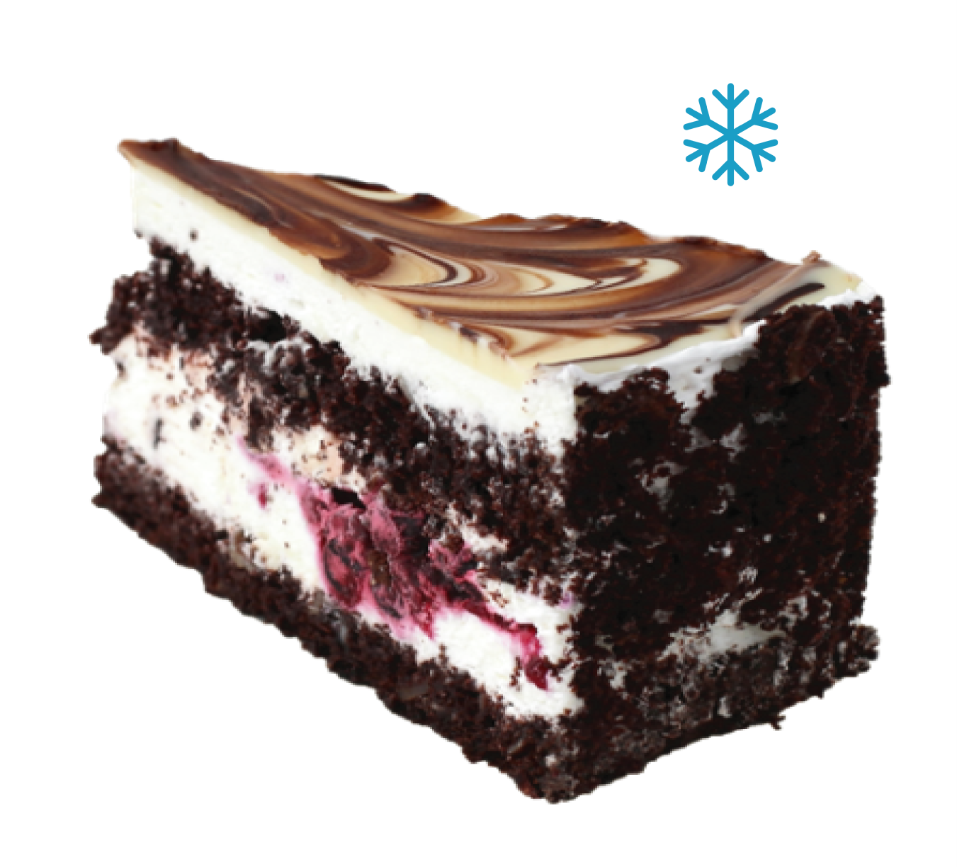 ягоды быстрозамороженные (смородина), крем на растительных маслах с массовой долей жира 26% (вода, жир растительный, сахар, декстроза, эмульгаторы (Е471, Е472b), подсластитель (Е420), стабилизатор (Е460i), казеин натрия, влагоудерживающий агент (Е422), соль, ароматизатор идентичный натуральному «пломбир»), сахар-песок, крем для глазирования и декорирования (сахар, растительные жиры (пальмовые) и масла (соевые, рапсовые), лесной орех, сухое молоко, эмульгатор : соевый лецитин, ароматизатор «ванилин»), яйца куриные, маргарин с массовой долей жира 82 %, вода питьевая, мука пшеничная высший сорт М54-28 или М54-25, глазурь черная (сахар, жиры растительные рафинированные, какао – порошок, лецитин (Е322), ароматизатор «ванилин»), загуститель соков и начинок Каби (Е 1414, Е1422, сахар), кокосовая стружка, какао-порошок, арахис обжаренный, корица.
