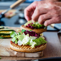 Нижнюю булочку смажьте кетчупом. И начинайте собирать бургер: выложите салат, ломтики курицы, затем сыр чеддер, цукини, ломтики перца и бекона, зеленый лук. Верхнюю булочку смажьте чесночным соусом и накройте ей бургер.