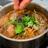 Добавить пару веточек розмарина и базилика, щепотку сушеного орегано. Накрыть крышкой и томить на медленном огне часа четыре.