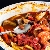 Сельдерей, чеснок и тимьян выложите на ту же пустую сковороду, через 3 минуты добавьте к овощам томаты и готовьте 3 минуты. Туда же добавьте банку томатов, 100 мл воды и немного сахара, тушите еще 3 минуты.