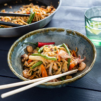 Выложите на тарелку лапшу с морепродуктами и украсьте перцем чили.
