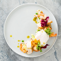 Приготовьте яйцо пашот. Разбейте яйцо в маленькую миску, добавьте немного уксуса в сотейник с водой (вода в сотейнике не должна бурлить), сделайте вращательным движением вилки (ложки) воронку в воде. Когда воронка исчезнет, влейте в центр кастрюли яйцо (оно не должно растечься, а собраться в комочек), продержите яйцо 2-3 минуты, аккуратно достаньте яйцо шумовкой и опустите в глубокую миску с прохладной водой.
