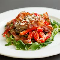 Выложить на тарелку корн, сверху – баклажаны и перец, полить кунжутным соусом. Затем аккуратно выложить собу. Украсить салат тонкой грудинкой "Златиборац", посыпать семенами кунжута.