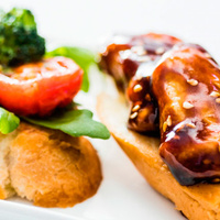 На румяный багет положить пару листиков рукколы, поверх - курицу терияки. Украсить жареными овощами.