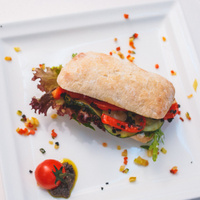 Чиабатту разрезать, смазать сначала пастой с креветками, затем положить свежие салатные листья, на них печеные овощи и тапенад. Накрыть вторым кусочком. Можно разрезать сэндвич на 2-4 части и подать на шпажках.